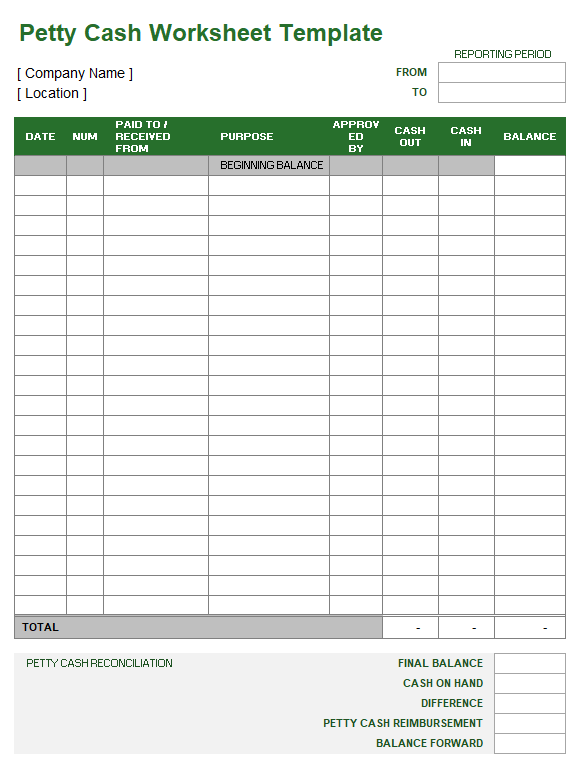 Petty Cash Worksheet Template