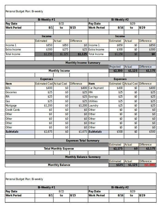 Bi-Weekly Personal Budget Template