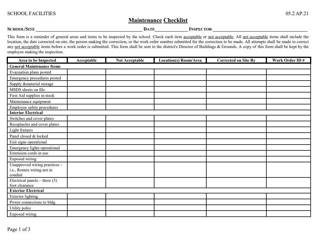 School Facility Maintenance Checklist Template