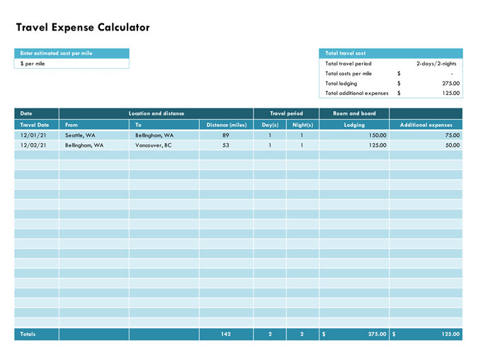 Travel Expense Calculator Sheet Template
