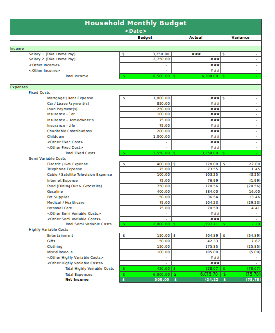 Monthly Household Budget Template