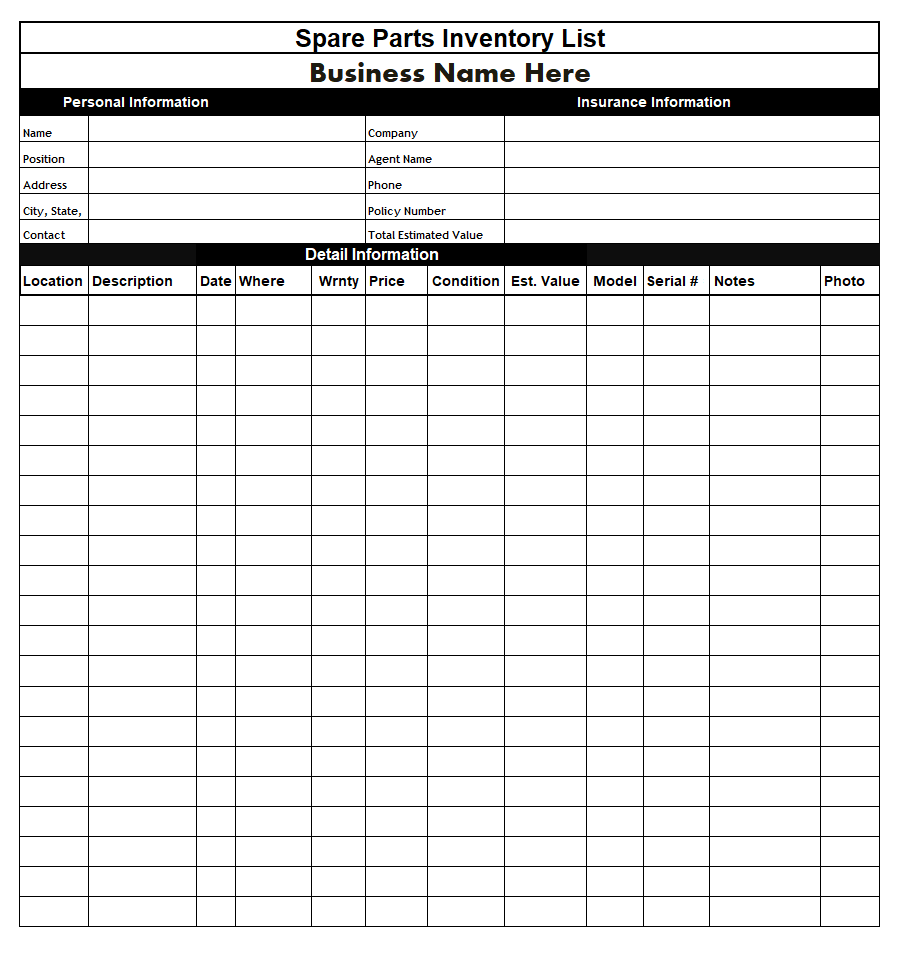 Spare Parts Inventory List Template