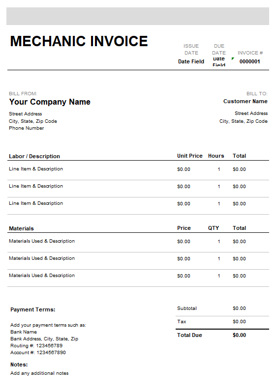 Mechanic Repair Work Invoice Template