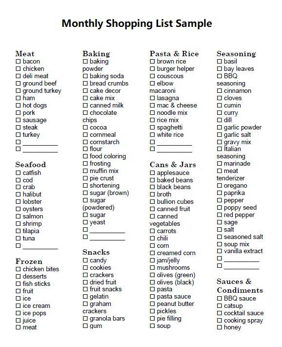 Monthly Shopping List Sample