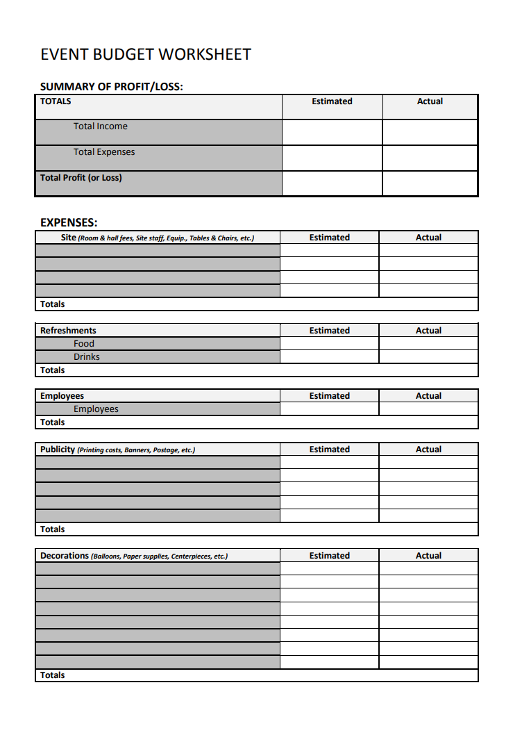 Event Budget Worksheet Template PDF
