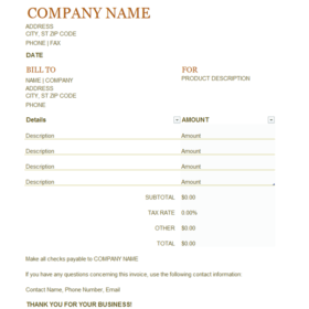 There are several benefits attached to these professional service invoice formats, which start by adding the company logo at the top. All these formats are easily editable and feature a neat layout. Moreover, these services invoices clearly mention the company name, client name and the services for which the invoice has been made. You can add a specific column for payment details in order to make sure all invoices are cash-based. From name to slogan, you can easily insert anything you wish to have in your template. Moving further, changing the design of an invoice can also bring many fruitful results, like: you can add a corporate design which can be easily customized, make changes to the layout, a special section to add client details, product description and rates for each part of the service, a separate column for taxes where you can divide party-wise tax collection. Usually, the logo goes in the top right area while the company name and address are in the top left area, but you can also edit these spaces and manage according to your needs.